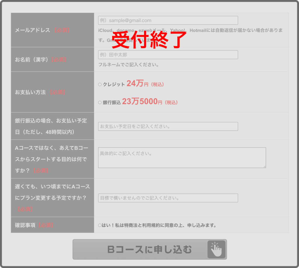 A5.Bコースの視聴期限(6ヶ月)以内にAコースへプラン変更すれば特典も差し上げます。ただし、後ろ向きな理由でBコースからスタートした場合には差し上げません。予めご了承ください。 |