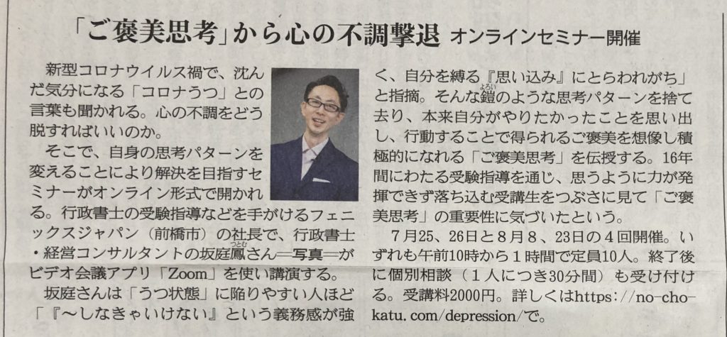 産経新聞「ご褒美思考」から心の不調撃退 オンラインセミナー開催