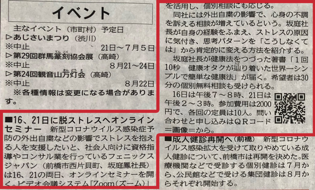 上毛新聞掲載 脱ストレスへ オンラインセミナー